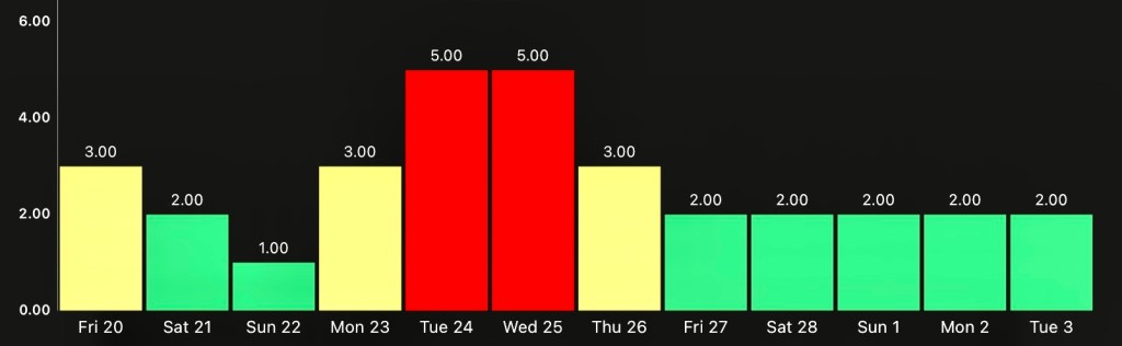For those of you who are hoping to catch the northern lights, the coming week has slight possibilities on Tuesday, February 24 and Wednesday, February 25. Of course, the aurora is dependent on magnetic storms on the sun’s surface so there’s always a chance of surprise northern lights. We try to post on Facebook whenever we hear local reports of visible lights.