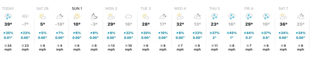 The week ahead has a mix of normal winter days and slightly warmer days, but nothing dramatic. There’s a little snow in the forecast also. Nice March conditions.