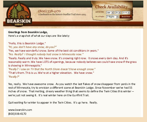 We’ve put together some nice winter packages to entice you up north. Our musher, Erik Simula, has many openings for dog sled trips and Chef Scott Bergstrom has an awesome menu planned for dining every Saturday. More than 40 miles of beautifully groomed ski trails await you. We have a surprising number of openings this weekend, which is normally one of the toughest weekends all winter to find a spot here — it’s not too late to drop everything and make a plan to head up north. Visit www.bearskin.com