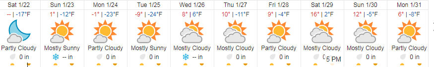 The forecast for the upcoming week looks like a classic January — pretty darn cold, but getting better. Sunny days are forecast and we should get a break from the almost daily snow. The Pisten Bully can have a break this week!