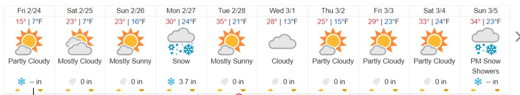 The ski trails are in excellent condition, just beautiful. Our upcoming forecast looks ideal. Lots of sun, just a little more snow to freshen up the trails, and moderate temperatures without being too warm. Perfect for a ski getaway.