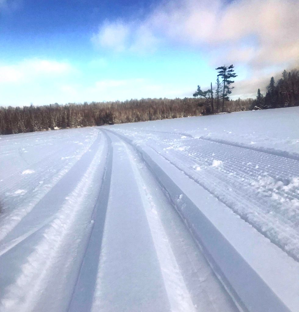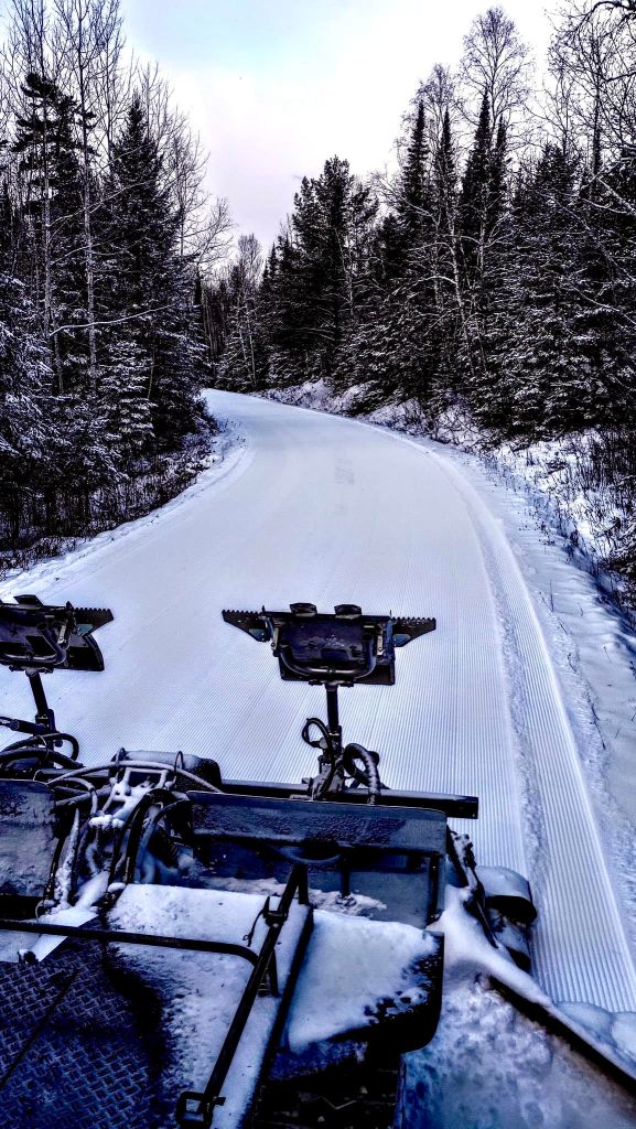 Our first snowfall was just enough to get skiing on the Central Gunflint Trail System started. Bearskin and Golden Eagle have both groomed extensive loops on the lakes with our Tidd-Tech snowmobile groomers.(Our lakes are safe for skiers, don’t worry — these long, narrow lakes froze early and guests have traversed the lakes extensively with skates while we waited for snow.) In addition, Quinn has been able to use the Pisten Bully to groom Campground and Summer Home Trails.The land trails have a skate deck but no tracks yet — he needs just a little more snow to add tracks.