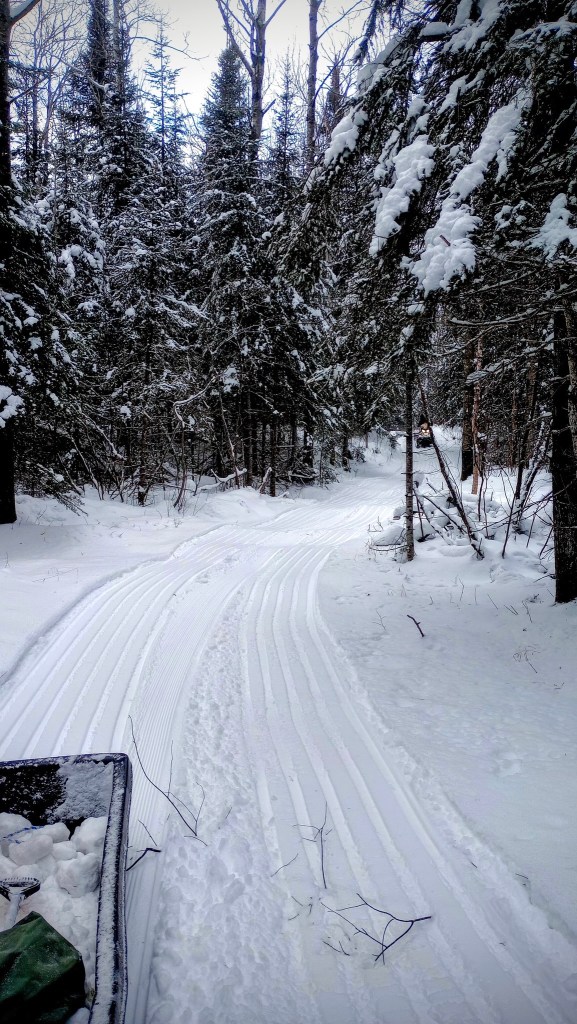 We spent the morning out packing the Lace Lake trail. For those not familiar with this trail, Lace Lake is a short loop trail that connects Poplar Creek to the Banadad Trail. The last few years it has struggled to get groomed, and starting this year we’ll be grooming it. We’d planned to start grooming it last year but never had the snow, so we’re excited to be able to get out there soon and give it the first Pisten Bully grooming in decades!