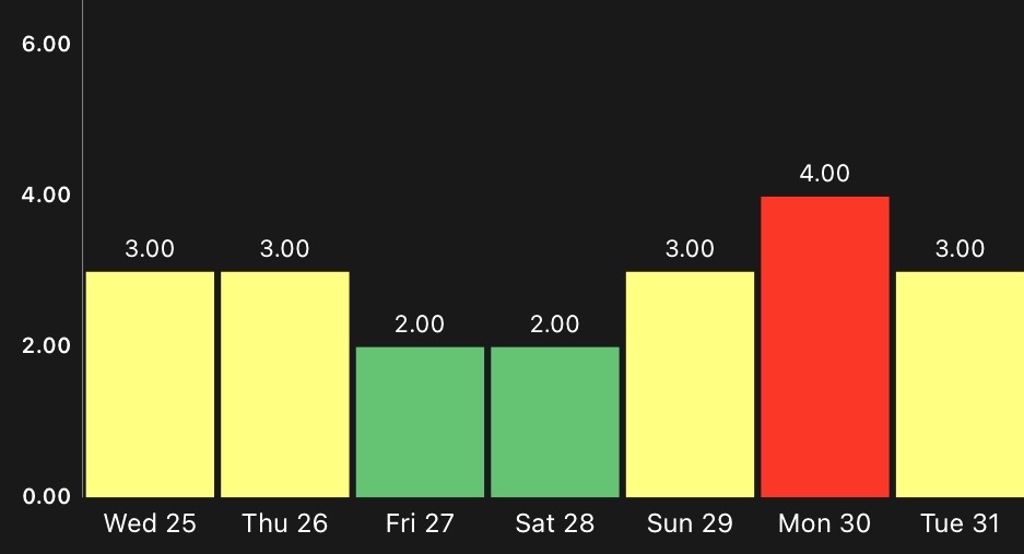 We have a good chance of northern lights this weekend. Originally the weekly aurora forecast did not look promising, but conditions changed on March 25 when a major solar storm occurred on the sun. Now there’s excellent potential this weekend for northern lights. If the skies are clear, you might expect the red bar on this graph to expand to Friday and Saturday.